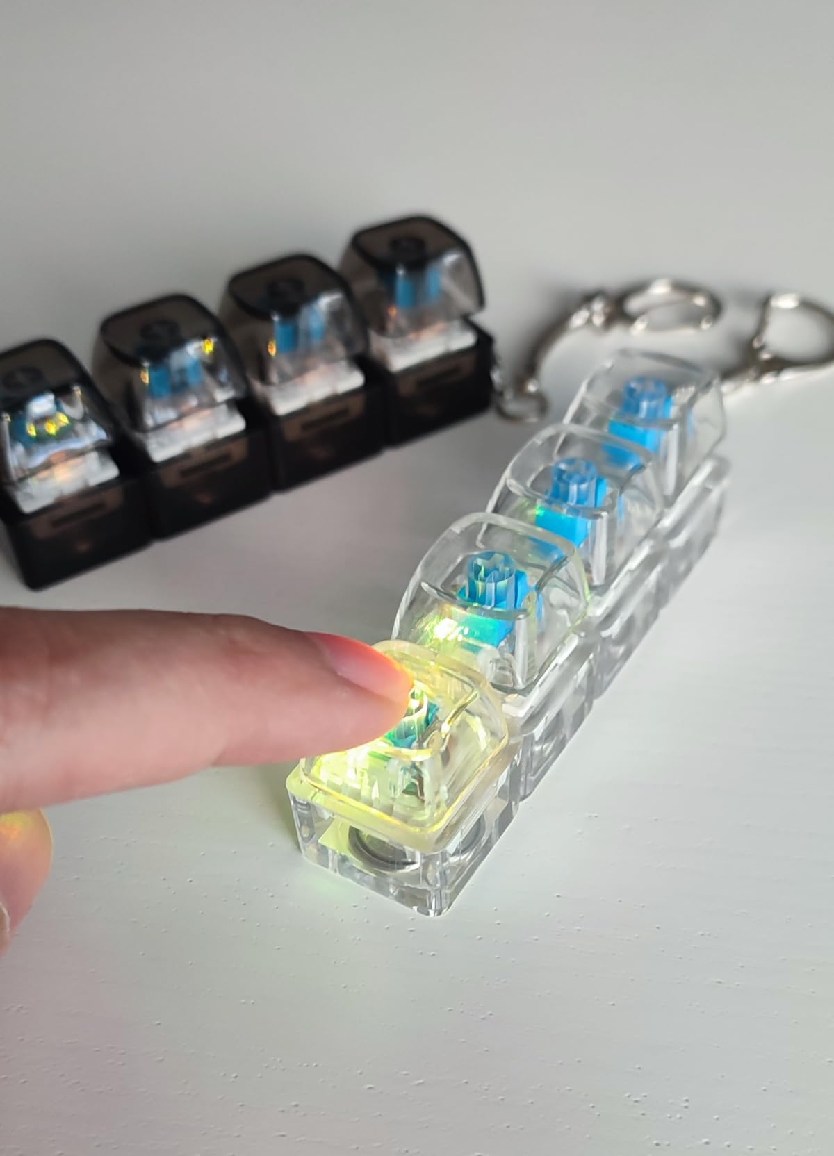 Bien hechos, muy fáciles de pulsar y muy coloridos. Mi amigo siempre empieza a jugar con ellos cuando se para junto a mi escritorio.